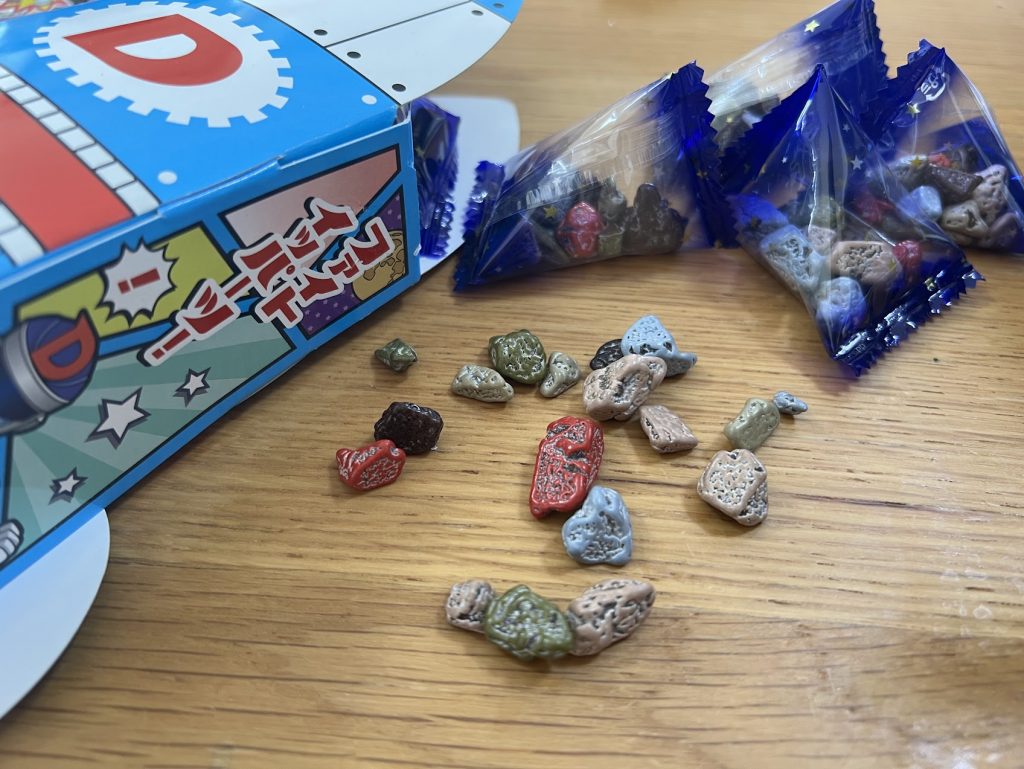 この石チョコ、見た目はまるで本物の小石や宇宙の隕石のかけらのようで、子どもたちは「えっ、これ食べられるの!?」と目を丸くします。色とりどりのチョコレートは硬い石にしか見えませんが、口に入れると甘くて美味しいチョコレート。見た目とのギャップに驚きつつ、ポリポリと食べ進めれば、宇宙探検のおやつを楽しんでいる気分になります。